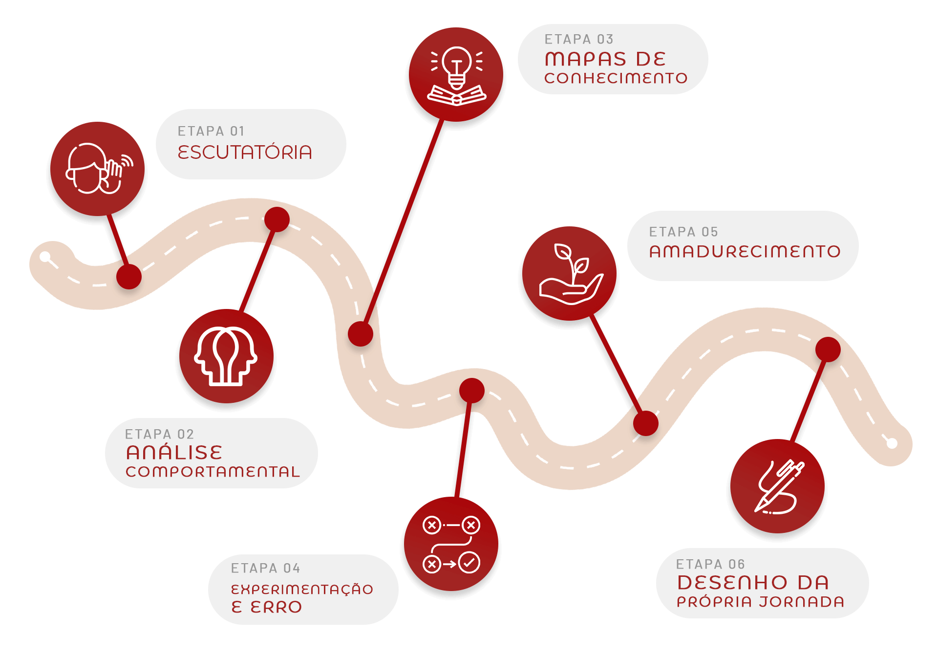 Desenho da Própria Jornada: o cliente já se apropriou dos conhecimentos despertos e os utiliza com consciência e estratégia. Neste estágio, ele é capaz de extrair o conhecimento de dentro de si e colocá-lo em ação com total autonomia. Cada passo dado se torna parte do desenho de sua jornada, conduzido e construído por ele mesmo, criando um caminho único e significativo